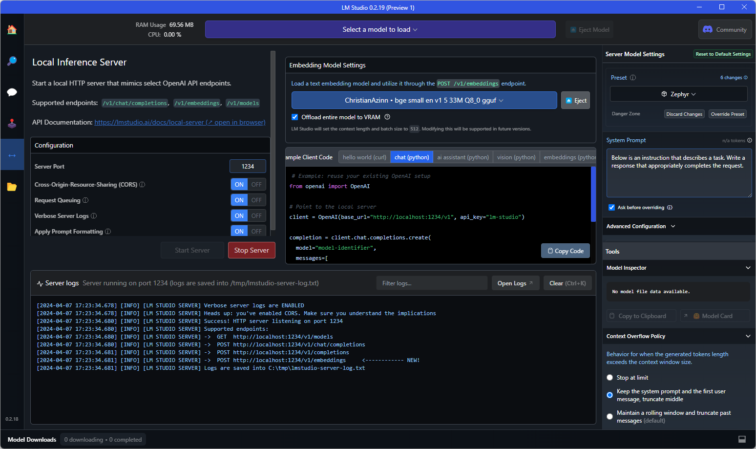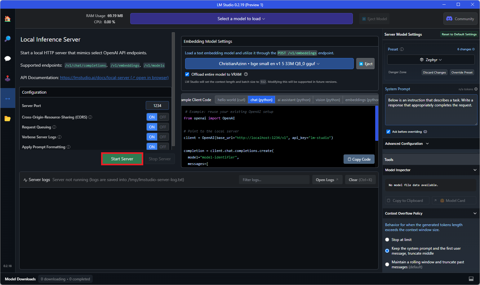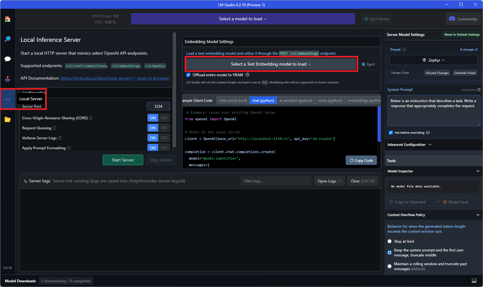 Once this model is finished downloading, navigate to the "Local Server" tab on the left menu and open the loader for text embedding models. This loader does not appear before version 0.2.19, so ensure you downloaded the correct version.