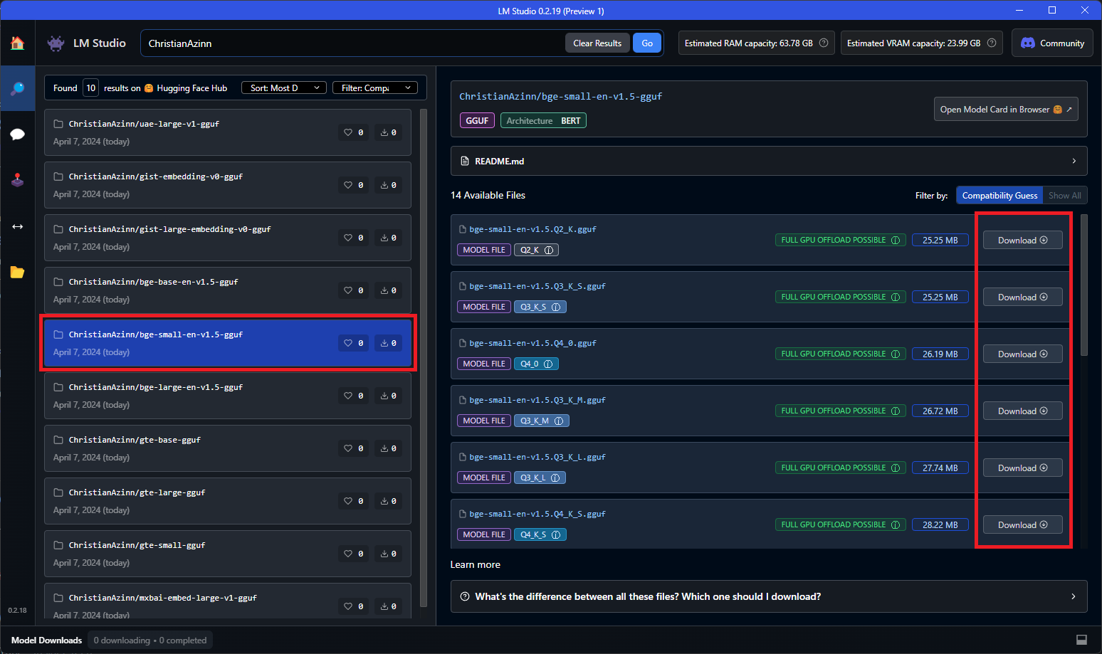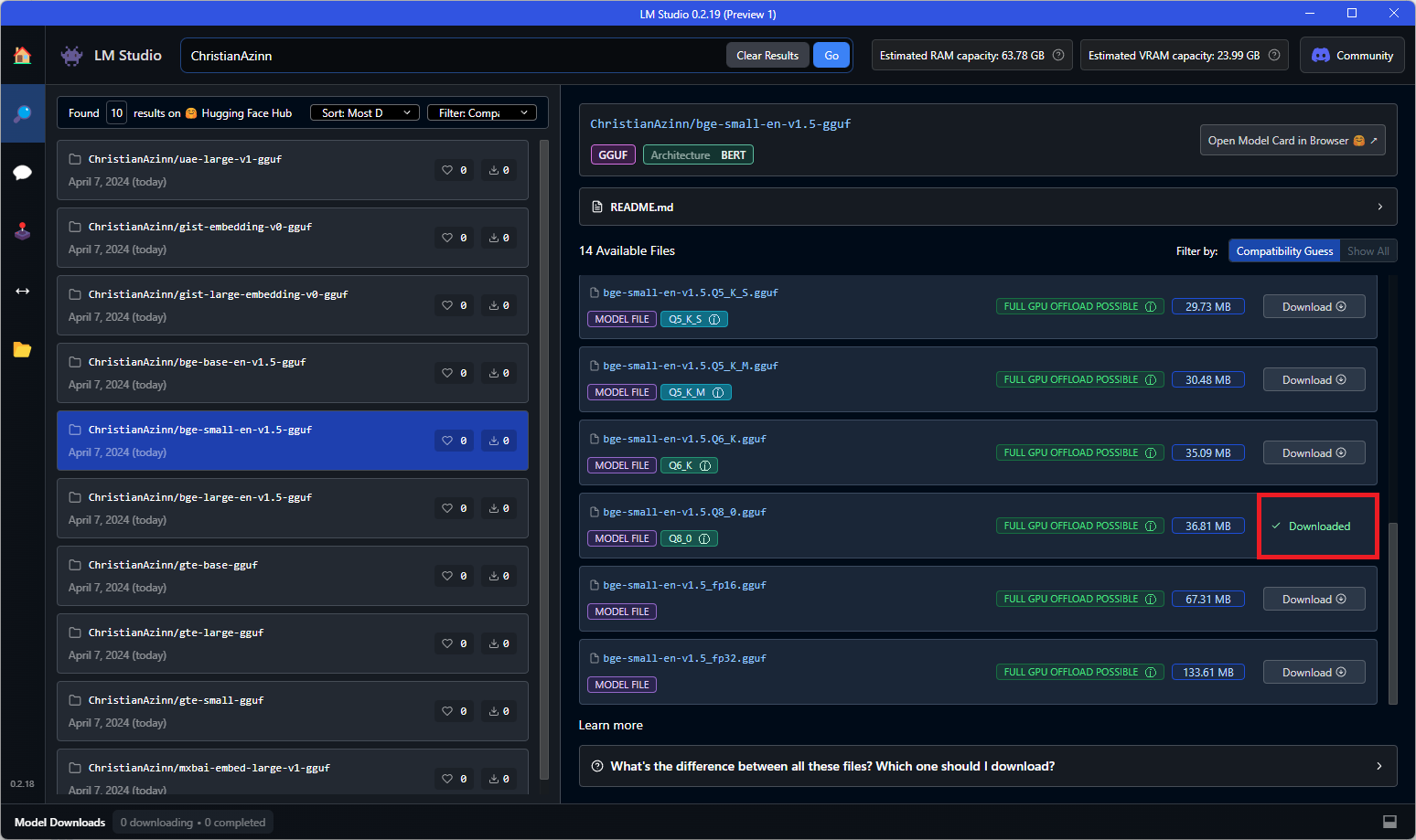 Select your model from those that appear (this example uses gte-small-gguf) and select which quantization you want to download. Since this model is pretty small, I recommend Q8_0, if not f16/32. Generally, the lower you go in the list (or the bigger the number gets), the larger the file and the better the performance.