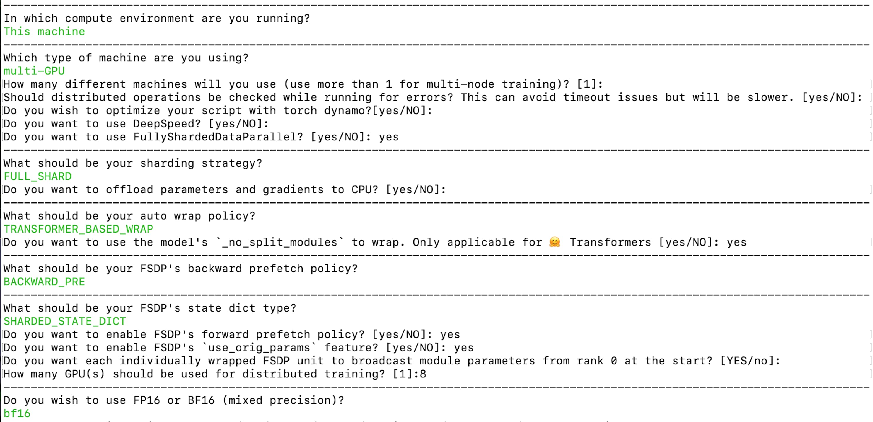 The resulting config is available here: fsdp_config.yaml. Here, the sharding strategy is FULL_SHARD. We are using TRANSFORMER_BASED_WRAP for auto wrap policy and it uses _no_split_module to find the Transformer block name for nested FSDP auto wrap. We use SHARDED_STATE_DICT to save the intermediate checkpoints and optimizer states in this format recommended by the PyTorch team. Make sure to enable broadcasting module parameters from rank 0 at the start as mentioned in the above paragraph on addressing Challenge 1. We are enabling bf16 mixed precision training.