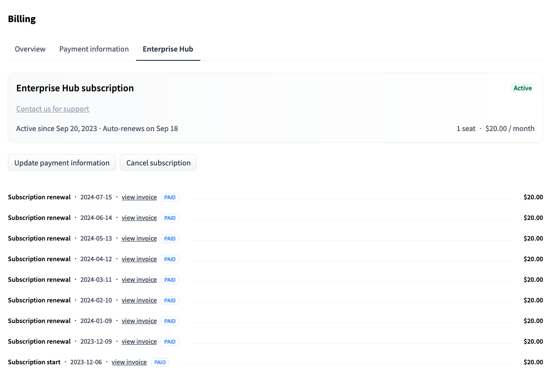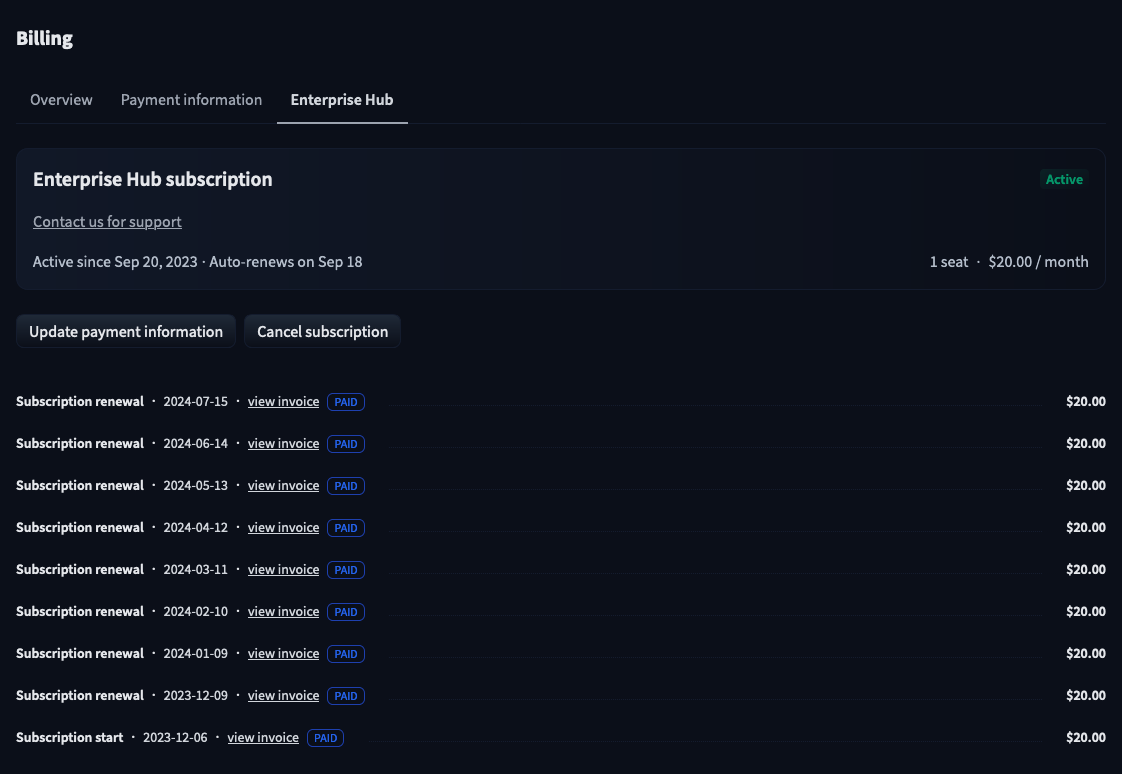 Similarly to the Enterprise Hub subscription, PRO subscriptions are billed like a typical subscription. The subscription renews automatically for you. You can choose to cancel the subscription at anytime in your billing settings: https://huggingface.co/settings/billing