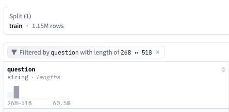If you click on a bar of a histogram from a numerical column, the dataset viewer will filter the data and show only the rows with values that fall in the selected range. Similarly, if you select one class from a categorical column, it will show only the rows from the selected category.