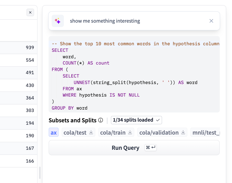 You can run SQL queries on the dataset in the browser using the SQL Console. This feature also leverages our auto-conversion to Parquet.