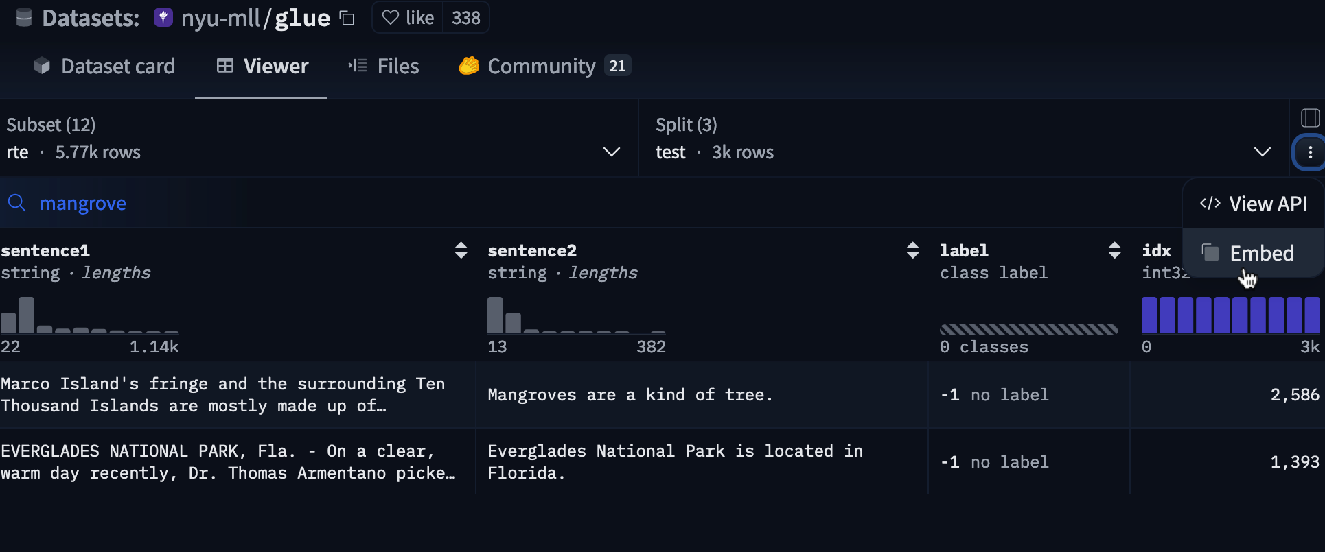 All the parameters of the dataset viewer page can also be passed to the embedded viewer (filter, search, specific split, etc.) by adding them to the iframe URL. For example, to show the results of the search on mangrove in the test split of the rte subset of the nyu-mll/glue dataset, you can use the following URL: