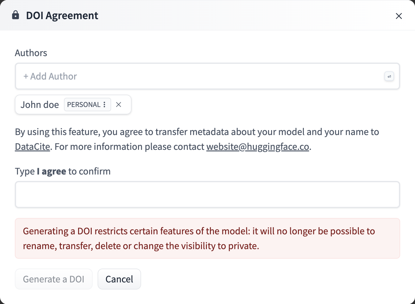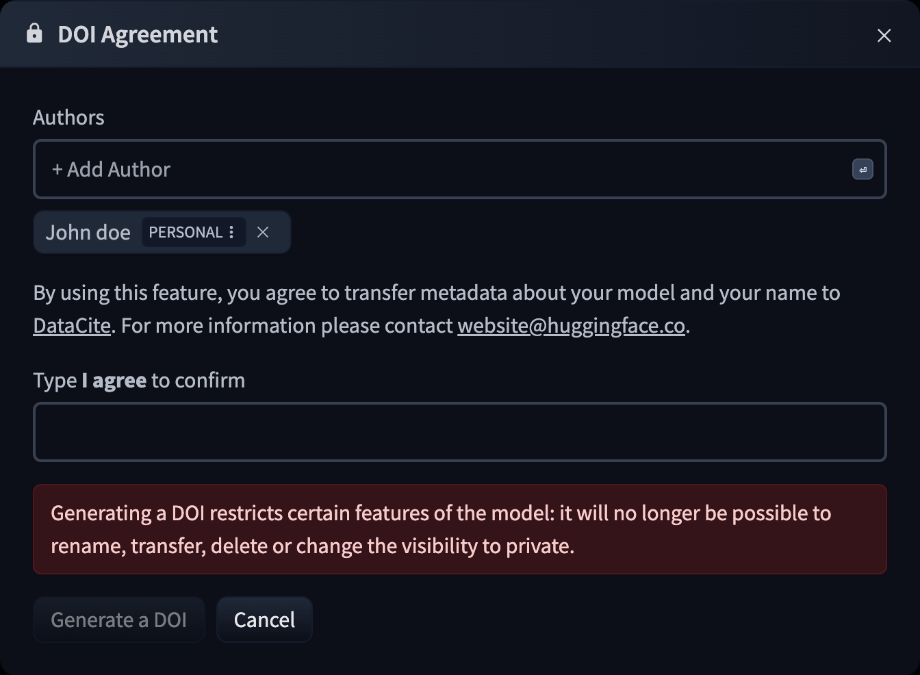 To generate the DOI for this model or dataset, you need to click on this button and acknowledge that some features on the hub will be restrained and some of your information (your full name) will be transferred to our partner DataCite. When generating a DOI, you can optionally personalize the author name list allowing you to credit all contributors to your model or dataset.
