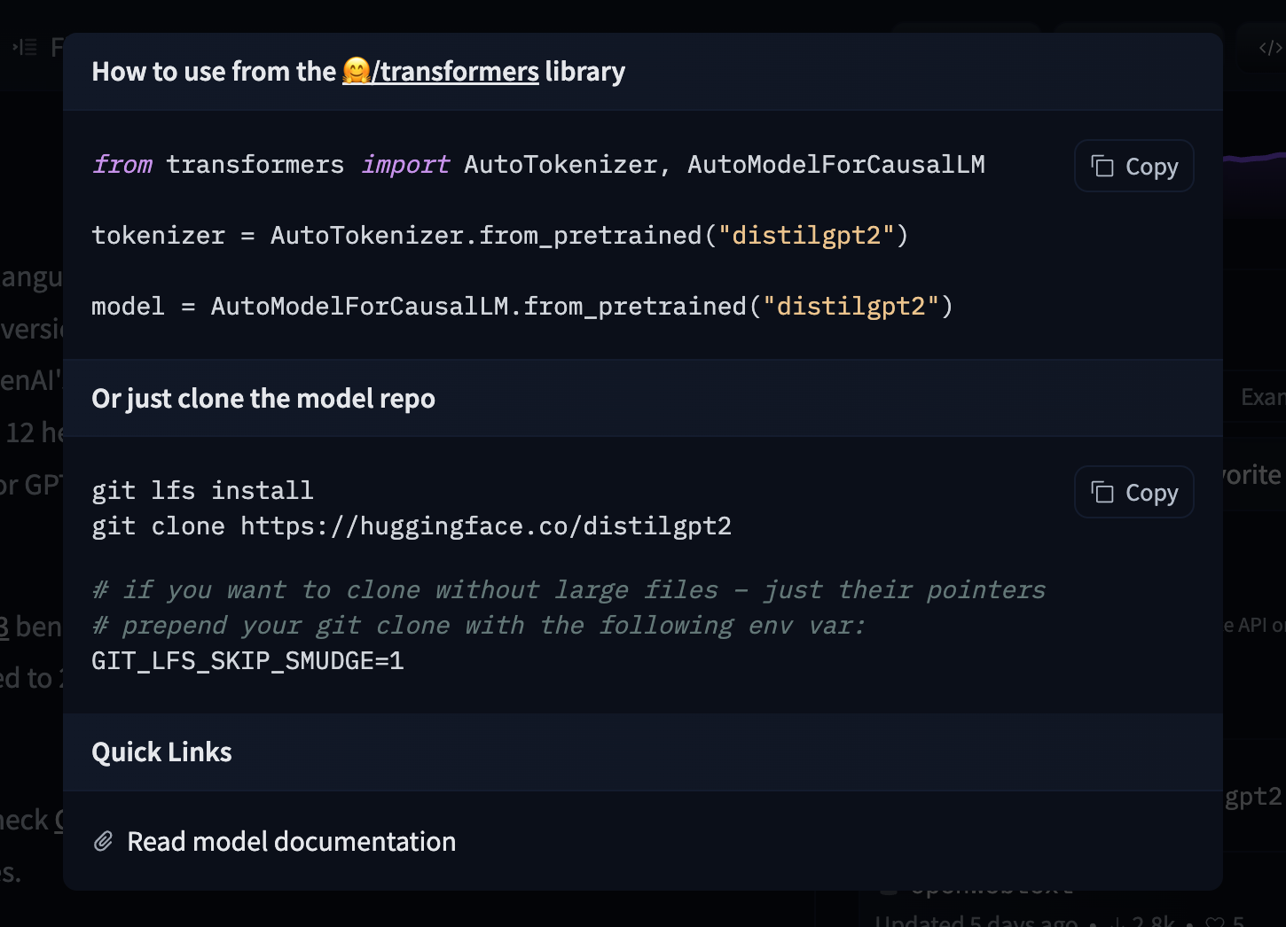 If a model on the Hub is tied to a supported library, loading the model can be done in just a few lines. For information on accessing the model, you can click on the “Use in Library” button on the model page to see how to do so. For example, distilbert/distilgpt2 shows how to do so with 🤗 Transformers below.