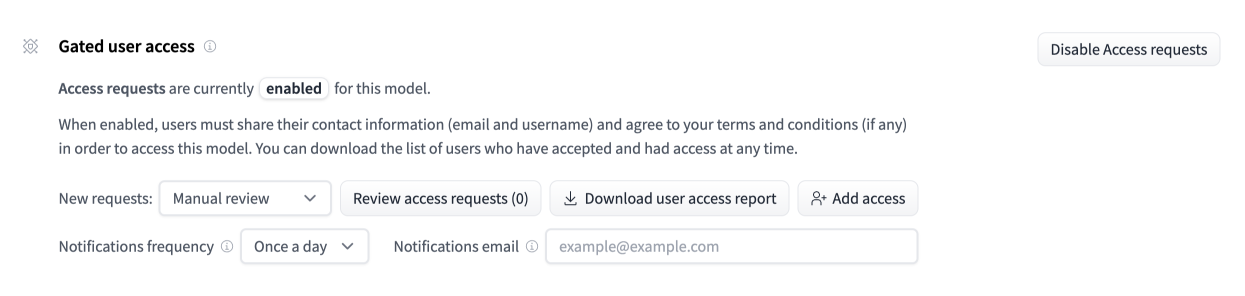 Once access requests are enabled, you have full control of who can access your model or not, whether the approval mode is manual or automatic. You can review and manage requests either from the UI or via the API.