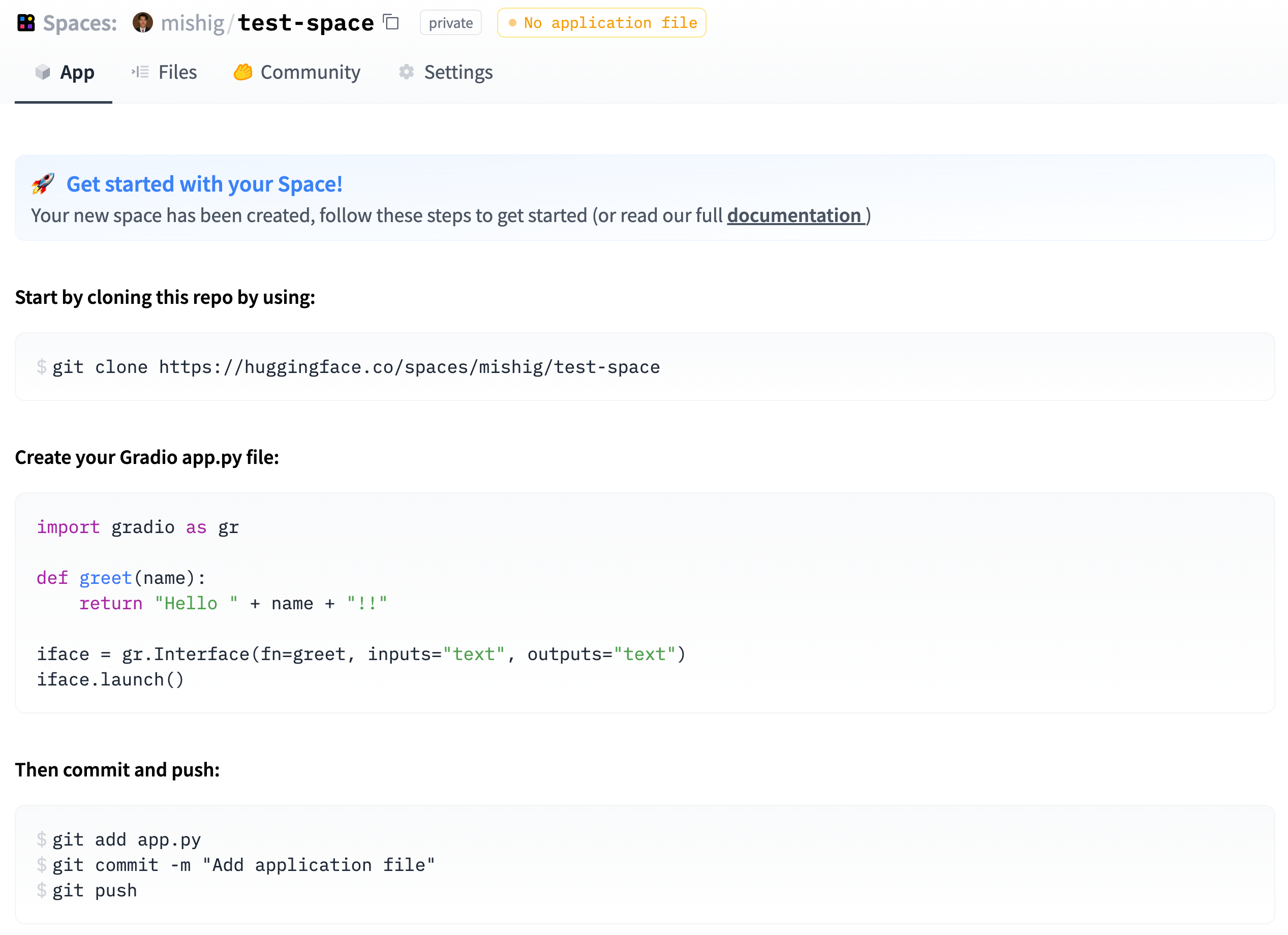 To make a new Space, visit the Spaces main page and click on Create new Space. Along with choosing a name for your Space, selecting an optional license, and setting your Space’s visibility, you’ll be prompted to choose the SDK for your Space. The Hub offers three SDK options: Gradio, Docker and static HTML. If you select “Gradio” as your SDK, you’ll be navigated to a new repo showing the following page: