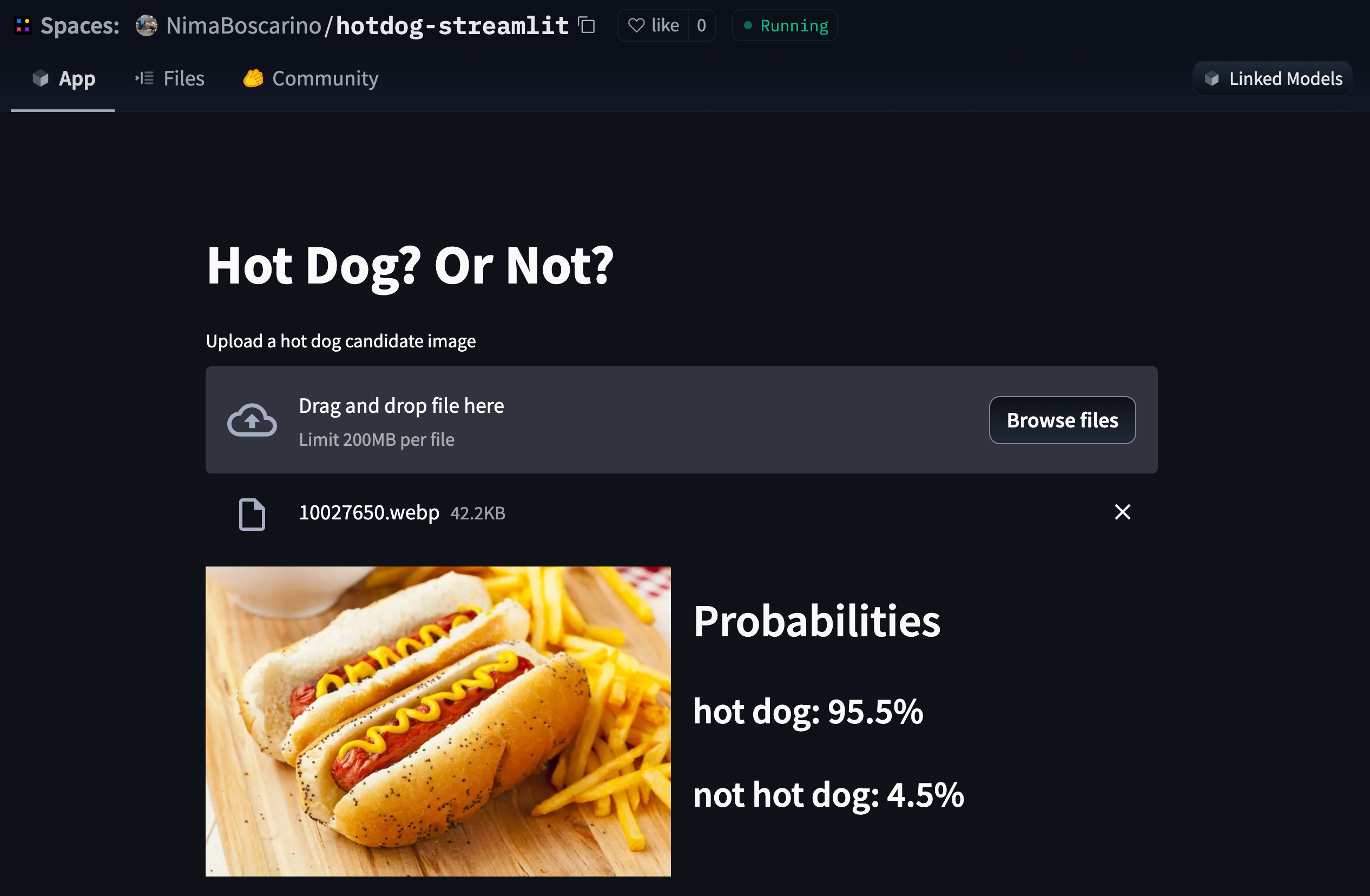This Python script uses a 🤗 Transformers pipeline to load the julien-c/hotdog-not-hotdog model, which is used by the Streamlit interface. The Streamlit app will expect you to upload an image, which it’ll then classify as hot dog or not hot dog. Once you’ve saved the code to the app.py file, visit the App tab to see your app in action!
