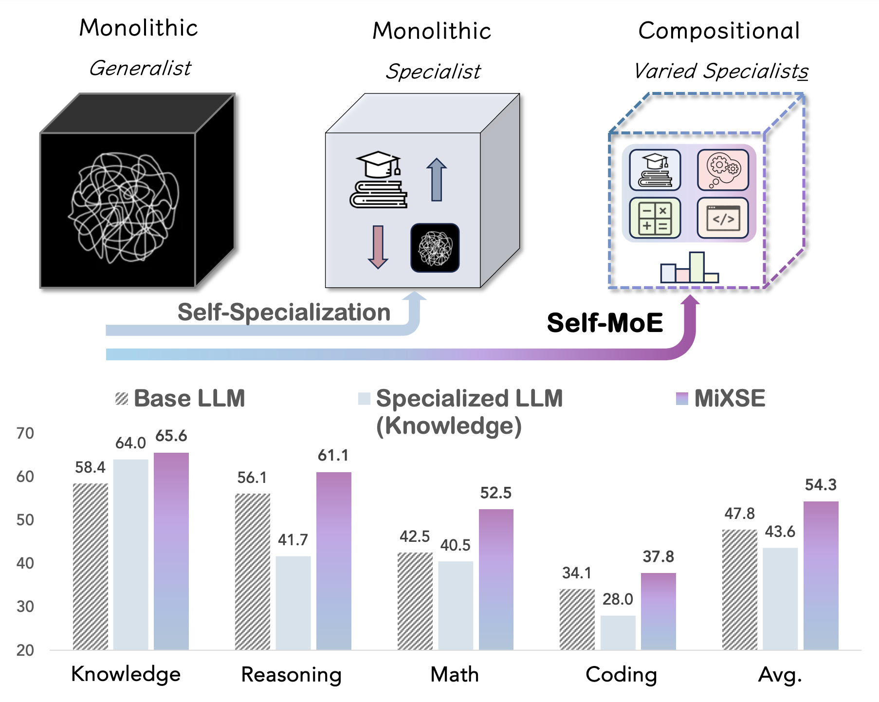 We introduce Self-MoE, an approach that transforms a monolithic model into a compositional system, called MiXSE (MiXture of Self-specialized Experts).