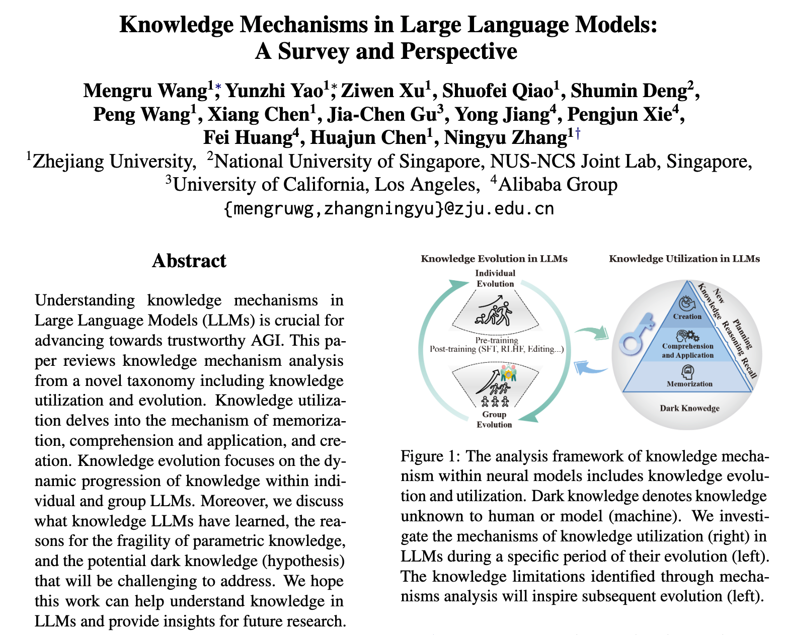 The paper examines knowledge mechanisms in Large Language Models, focusing on utilization (memorization, comprehension, application, and creation) and evolution, addressing the fragility of parametric knowledge and potential dark knowledge.